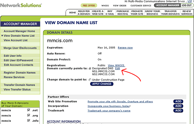 Display the account details and then click on the edit link to the right of the "Designated DNS" line for "Domain currently points to:"